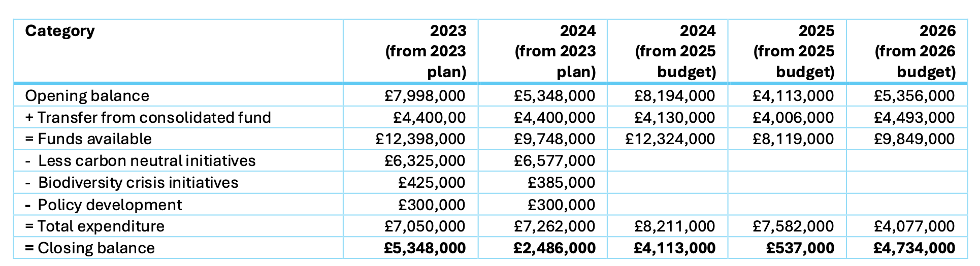 The Climate Emergency Fund was established to fund the various CNR initiatives. However, it is recognised that the Fund is not sufficient to finance all the policies needed to achieve net zero. Expenditure under the Fund is estimated to be £7.6 million in 2025, but budgeted to fall to around £4 million in 2026 and future years.