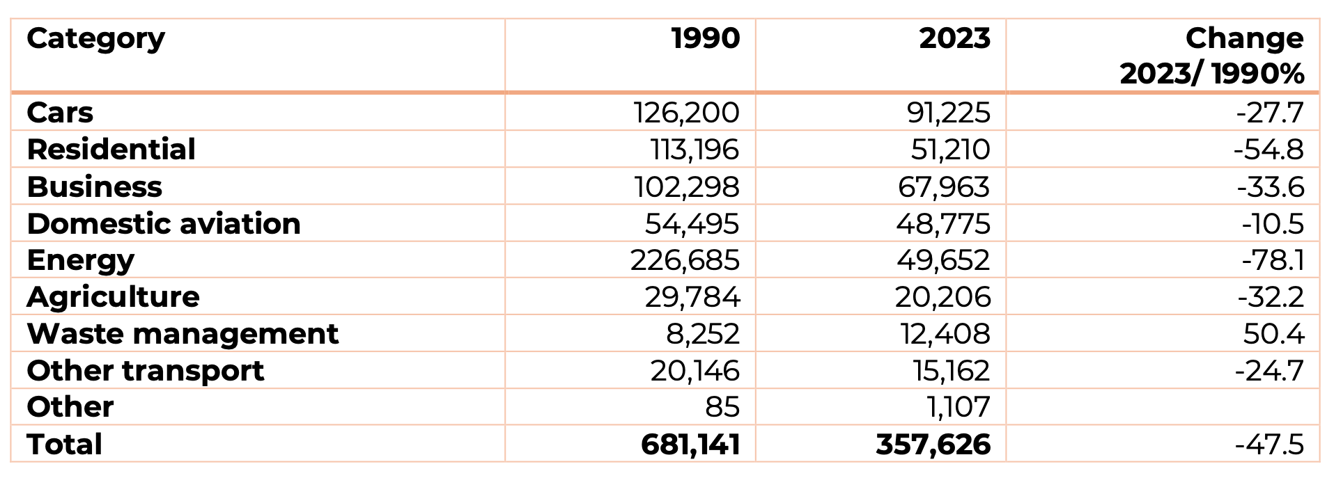 Table 2 Carbon emissions, tonnes CO2 equivalent, 1990 and 2023\