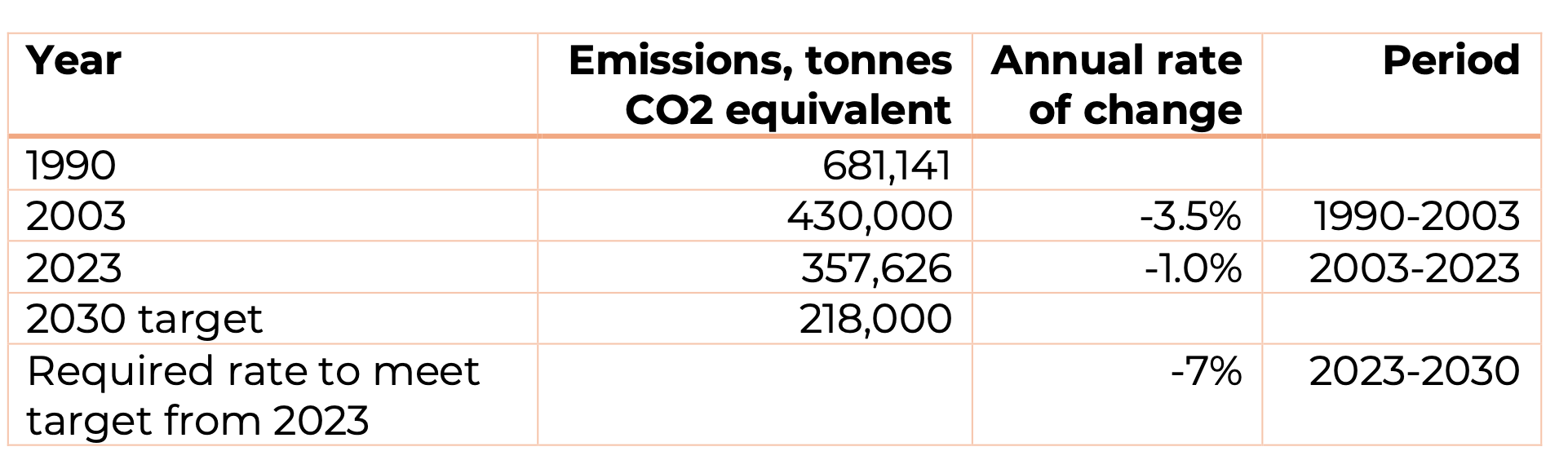 To achieve the 2030 target, emissions will need to be 218,000 tonnes CO2 equivalent, a reduction of 39% on the 2023 figure, an annual rate of about 7%. Each year that emissions fall below the required annual rate the greater the reduction required in subsequent years.