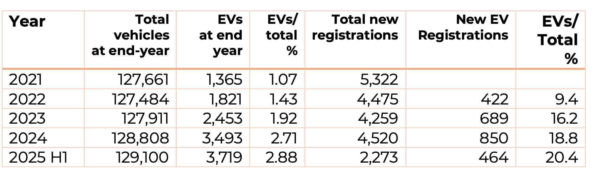 2. Although 128,808 vehicles were registered at the end of 2024 many are no longer in use. It is estimated that there are about 91,000 vehicles in use. So, about 3.8% of vehicles in use at the end of 2024 were electric.