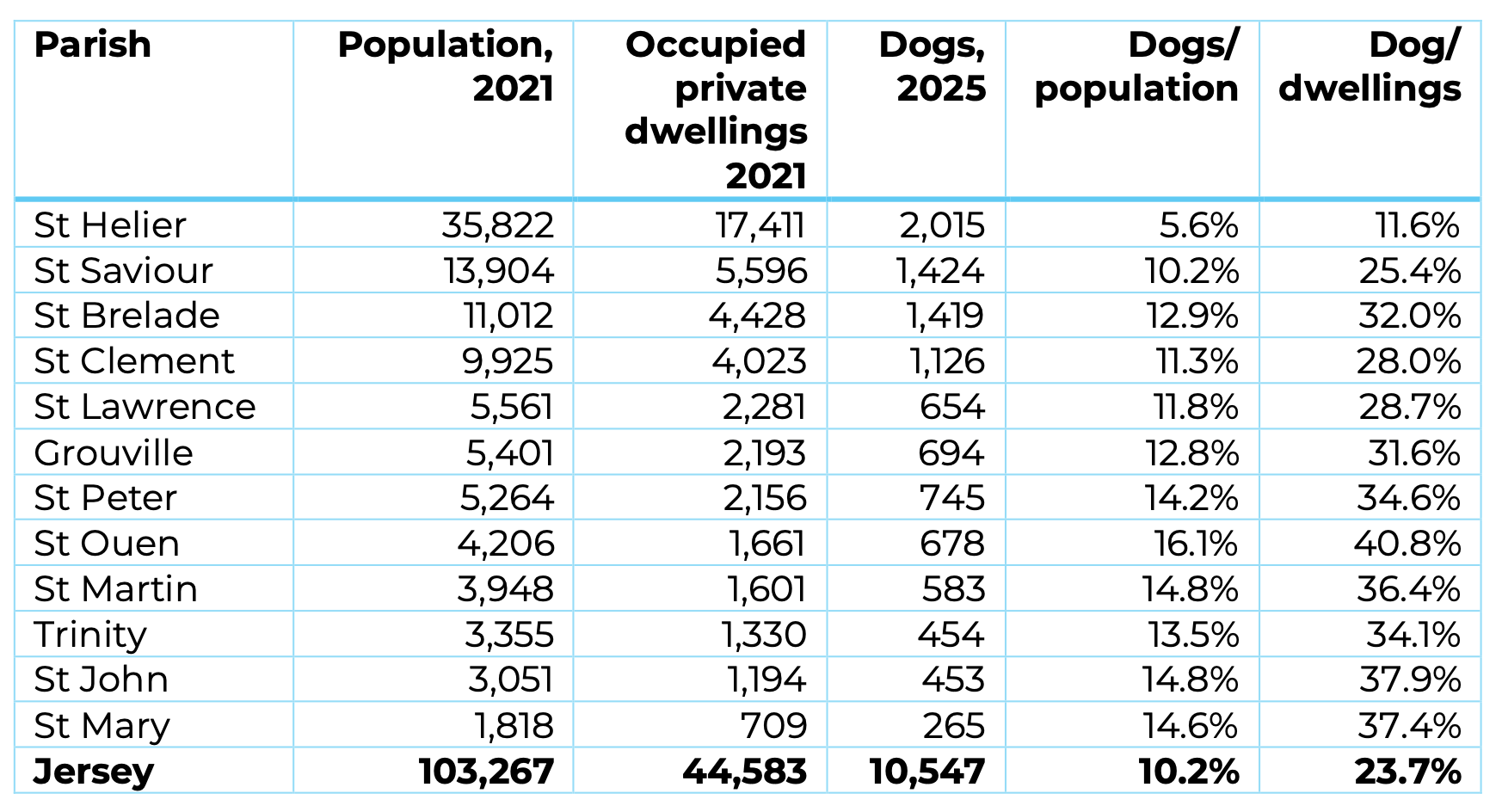 The dog/households percentage is highest in St Ouen (40.8%) and is over 34% in St Martin, St Peter, Trinity, St John, Trinity and St Mary. It is lowest in St Helier (11.6%). Between 2017 and 2025 the licensed dog population increased by 61% in St Lawrence, 38% in Grouville, 37% in St Saviour and 25% in St Clement and St Helier.
