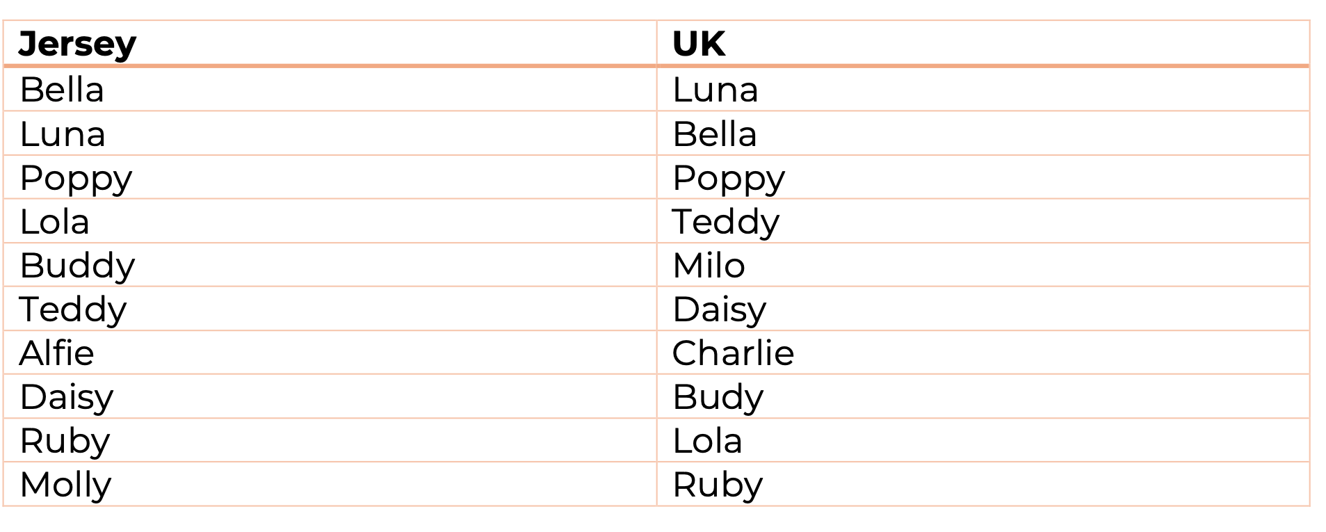 The most common dog names given on licence applications in Jersey and the UK are Bella, Luna and Poppy.