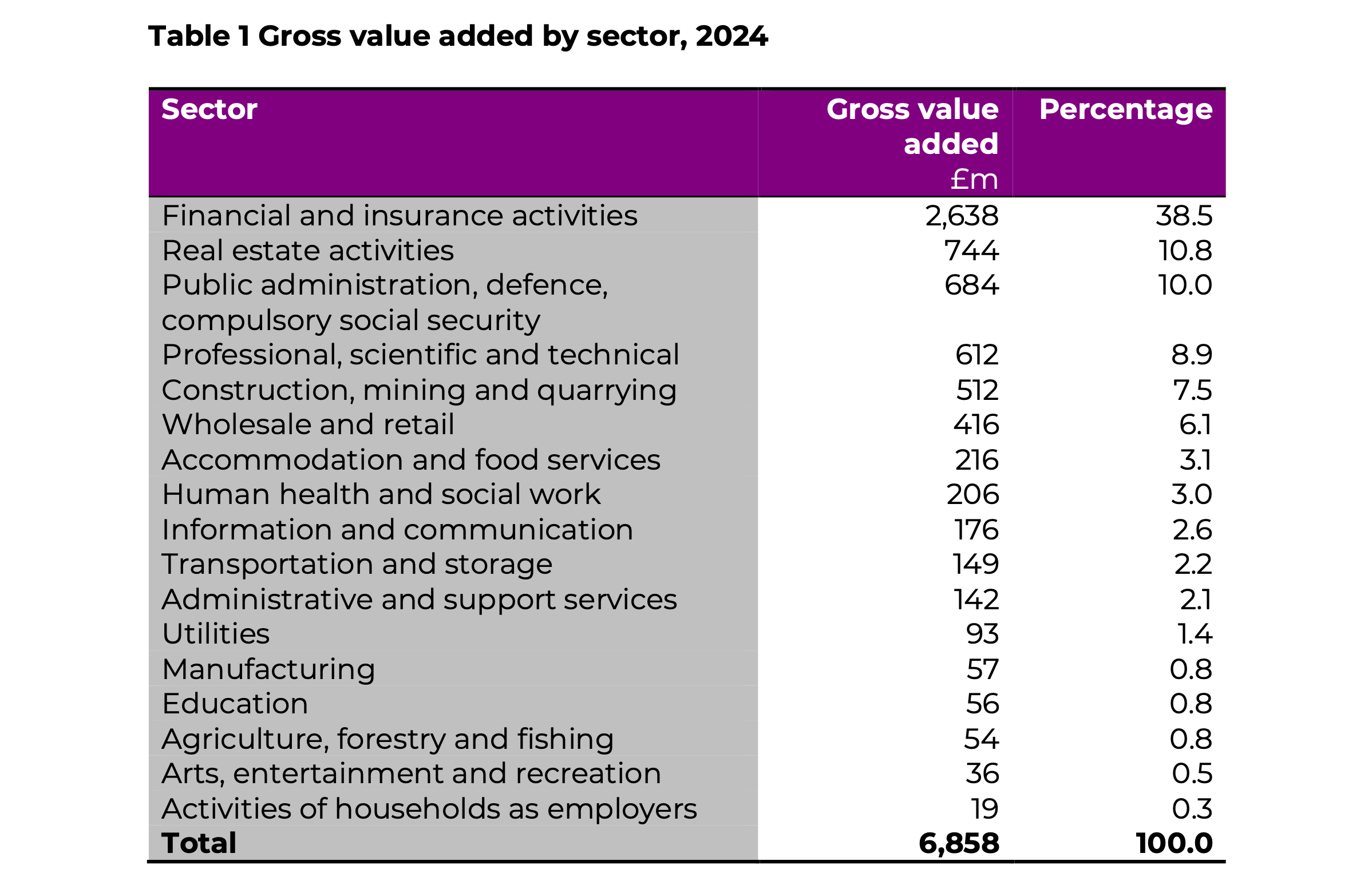 The annual report Measuring Jersey’s Economy GDP and GVA – 2024 was published on 3 October 2025. Table 1 shows a breakdown of Gross Value Added (GVA) by sector in 2024.