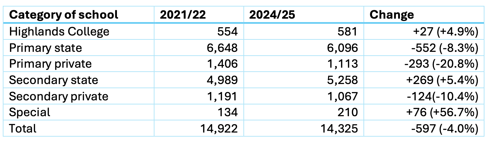 More generally, there has been a move away from private schools to state schools, including those that are fee-paying. Between 2021/22 and 2024/25, the total number of pupils fell by 4%. The numbers attending private schools fell by 16.1% while the numbers attending state schools fell by 2.4%.