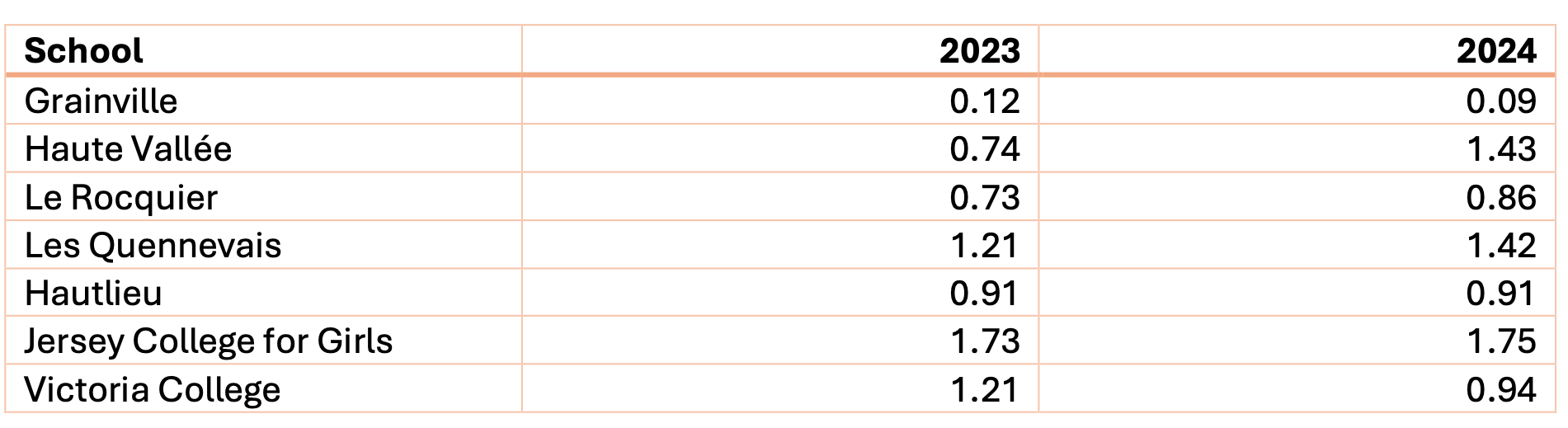 Jersey does not publish Jersey 8 or its equivalent of Progress 8 as a matter of course; rather, it releases data only in response to Freedom of Information requests. Table 5 shows the Jersey value added figures for 2023 and 2024.