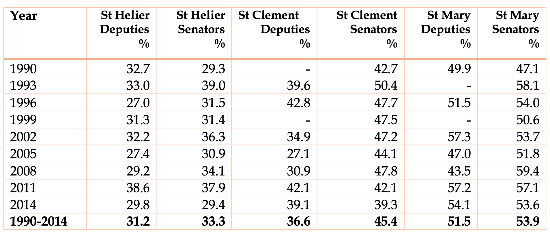 The table shows significantly higher turnout in St Mary, representative of the country parishes, than in St Clement which in turn has much higher figures than St Helier. Until the 2011 election, elections for senators were held separately from those for deputies. In that year and the 2014 election, turnout was very similar in the senator and deputy elections. However, prior to that, when the elections were on different days, turnout in the elections for senators was significantly higher than for deputies - by 2.4 percentage points in St Mary, 2.1 percentage points in St Helier and 8.8 percentage points in St Clement.