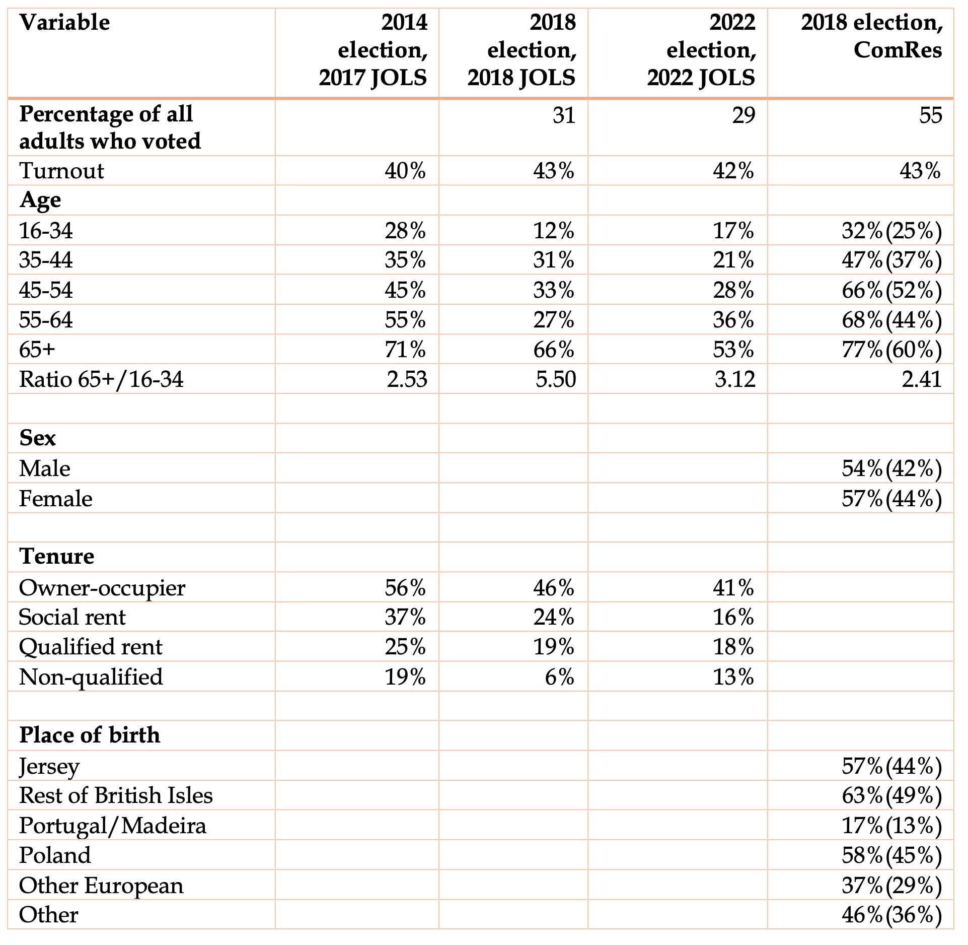 Statistics Jersey conducts an annual Jersey Opinions and Lifestyle Survey (JOLS) and data are also available from a survey commissioned after the 2018 election. There are four separate surveys that give relevant information on turnout for different categories of people –