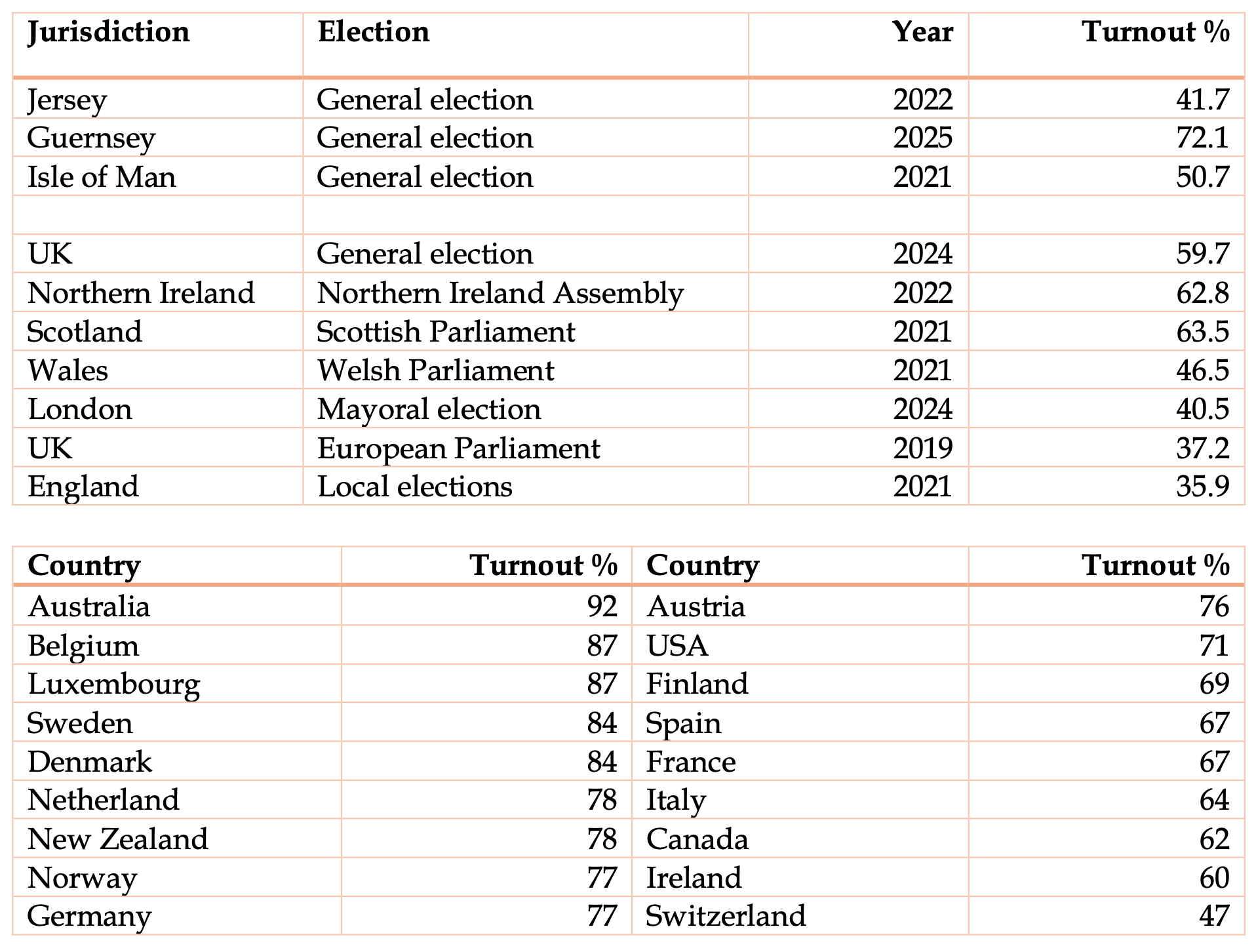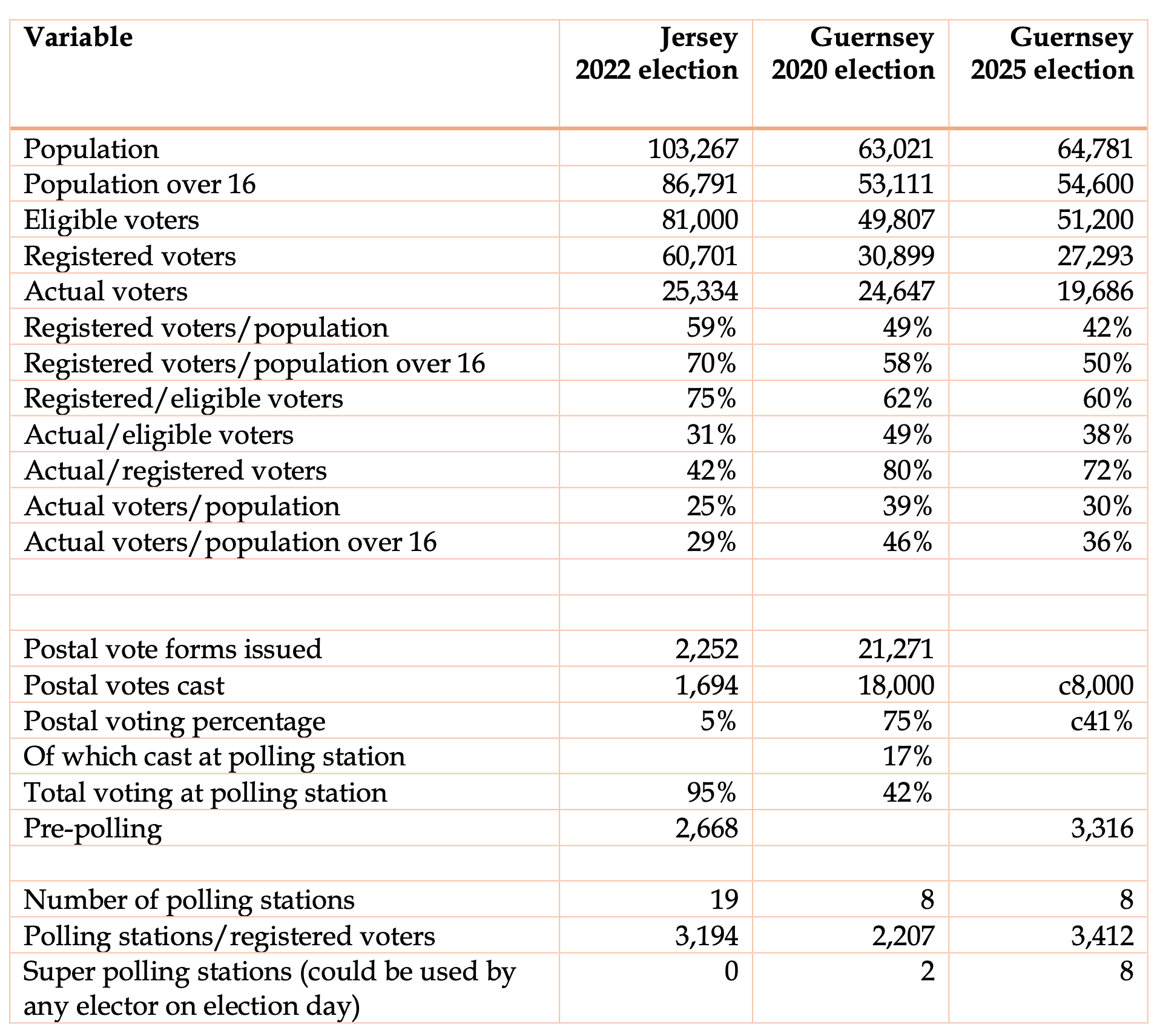 Note: The 2020 Guernsey figures are taken from official data. Comprehensive statistics on the 2025 election have not been published and there is also uncertainty about the population figure. Accordingly, the percentages have a margin of error.