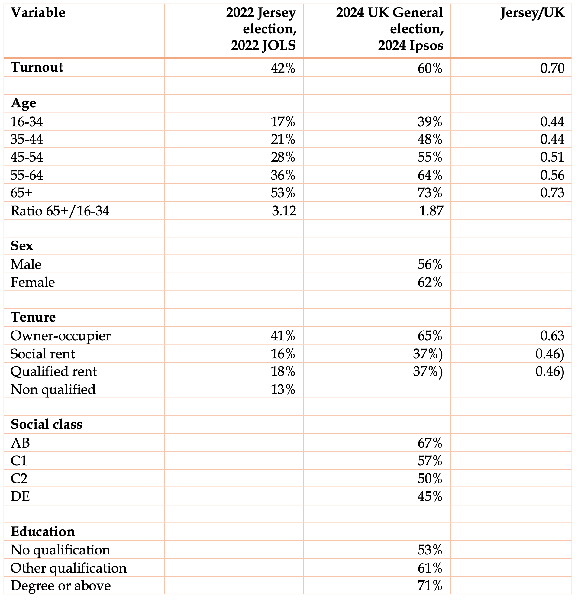 - For owner-occupiers Jersey turnout was 63% of the UK proportion; for renters, it was 46%.