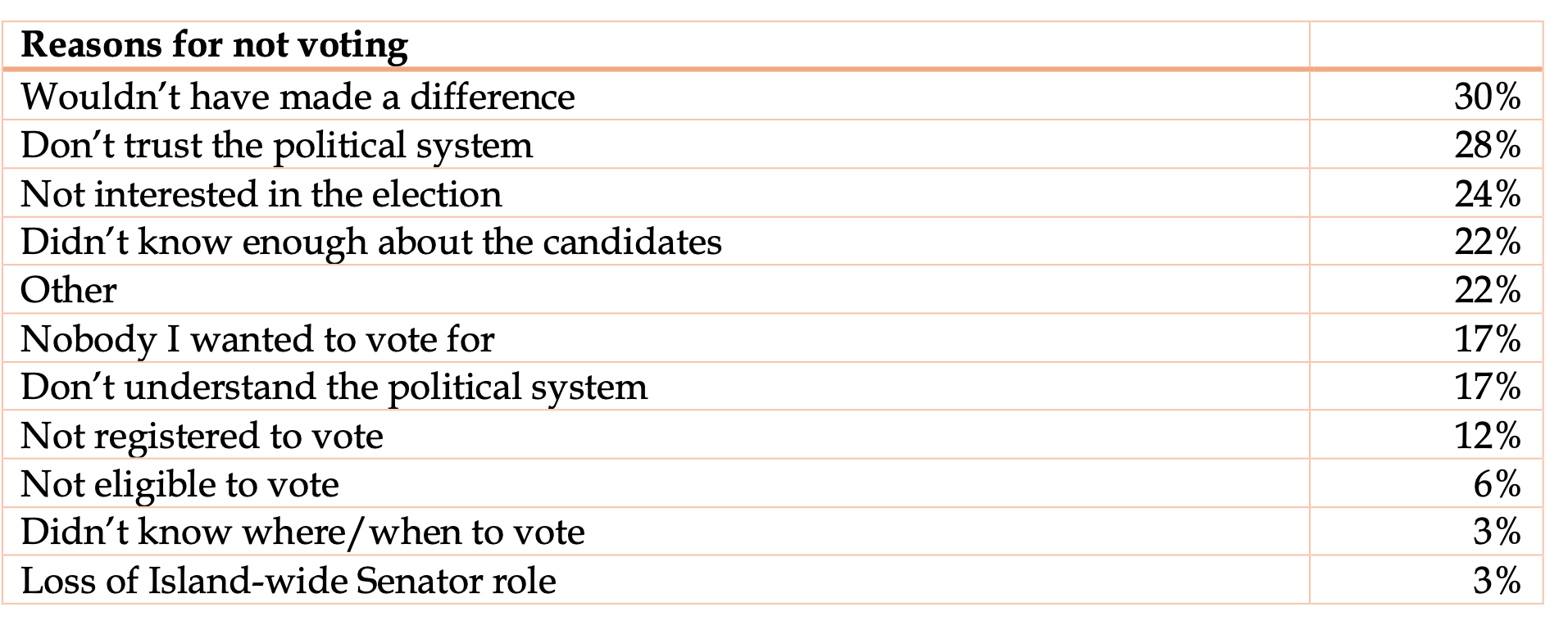 The “Didn’t know where or how to vote” and “Loss of the Island-wide Senator role” options recorded only 3% each.