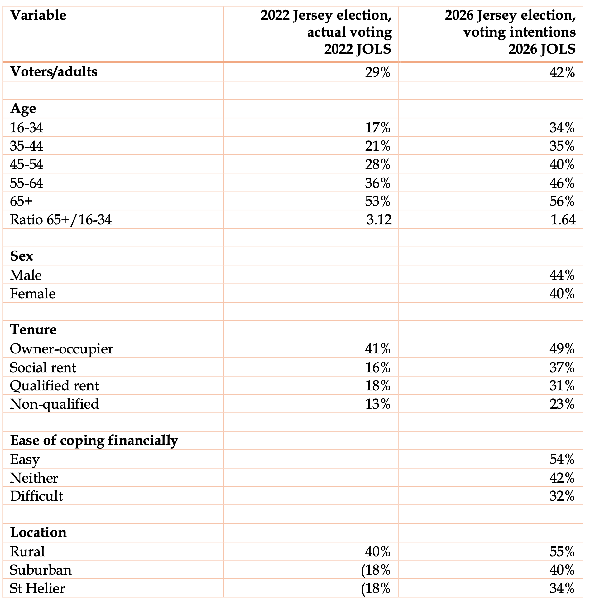 The JOLS breaks down voting intentions by characteristics. Table 11 compares these with the actual 2022 figures recorded in the 2022 JOLS. While those figures are based on the survey, the breakdown between different categories is likely to be more reliable than the total figures.