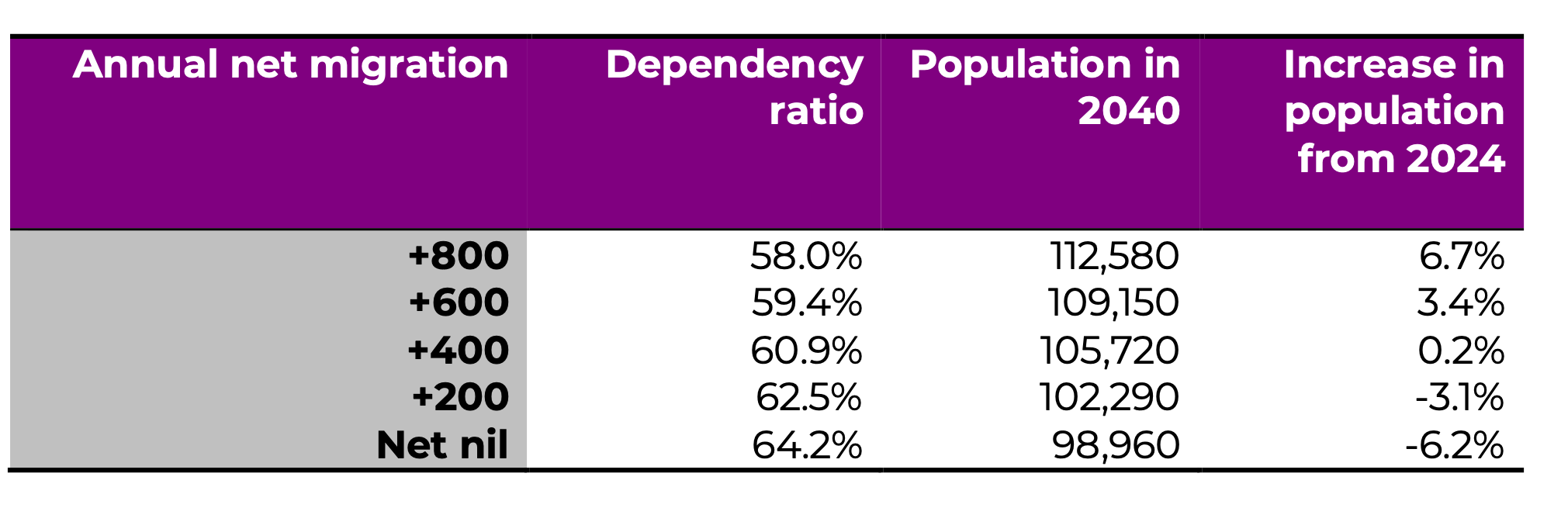 The table shows that with net nil migration the population would fall by 6.2% by 2040, and the dependency ratio would increase significantly to 64.2%. Net migration of 800 a year would result in a 6.7% increase in the population by 2040 but with a still significant rise in the dependency ratio. The key factor is the ageing population. Even with net nil migration the number of people 65 and over is estimated to increase from 20,600 in 2024 to 27,930 in 2040.